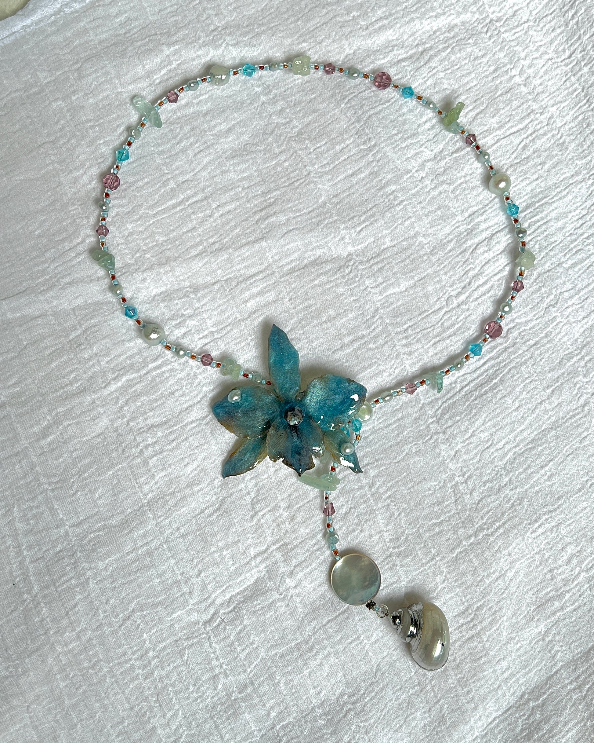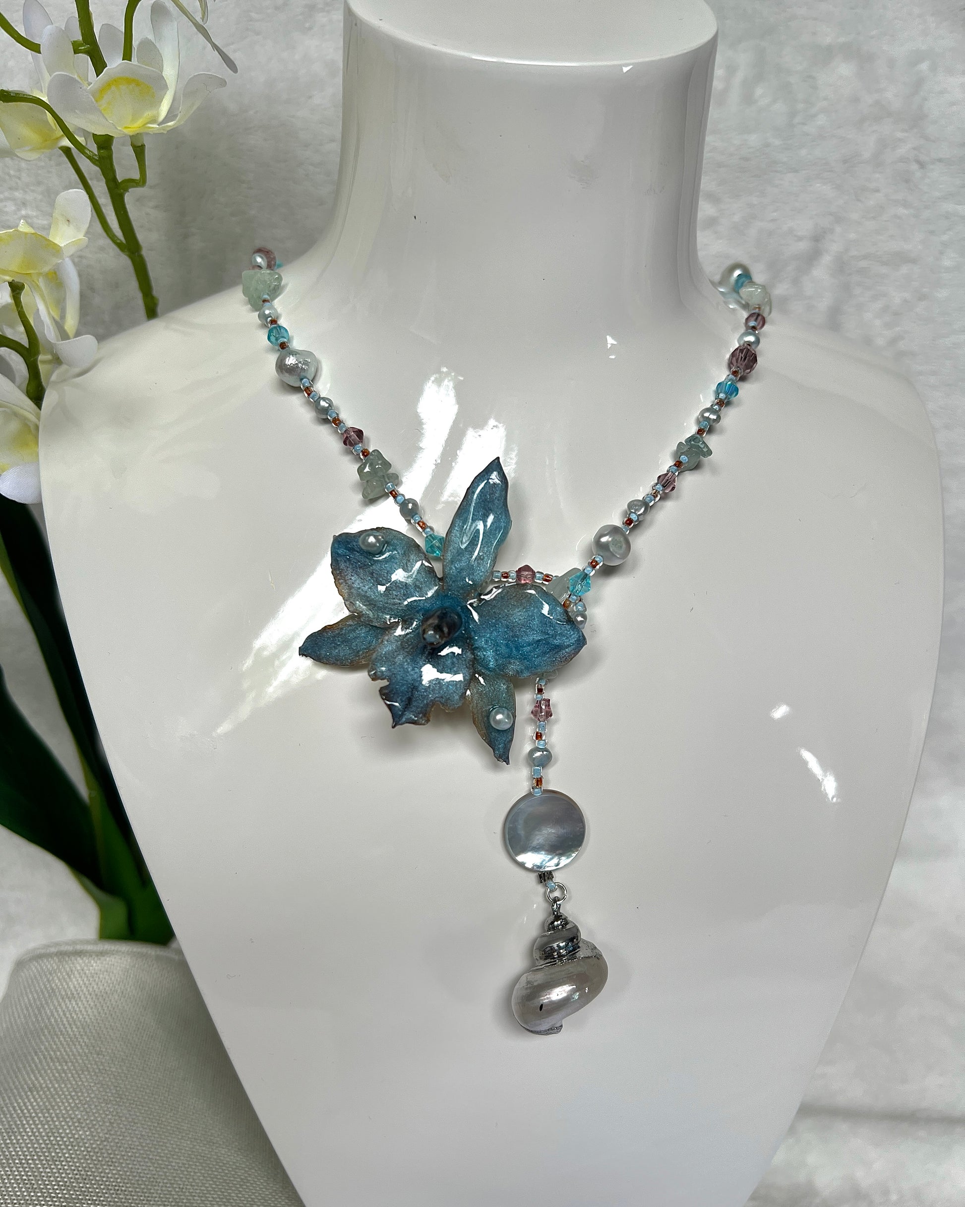 A glazed blue Cattleya orchid rests on an elegant loop necklace, crafted for effortless beauty and adjustable to your perfect length