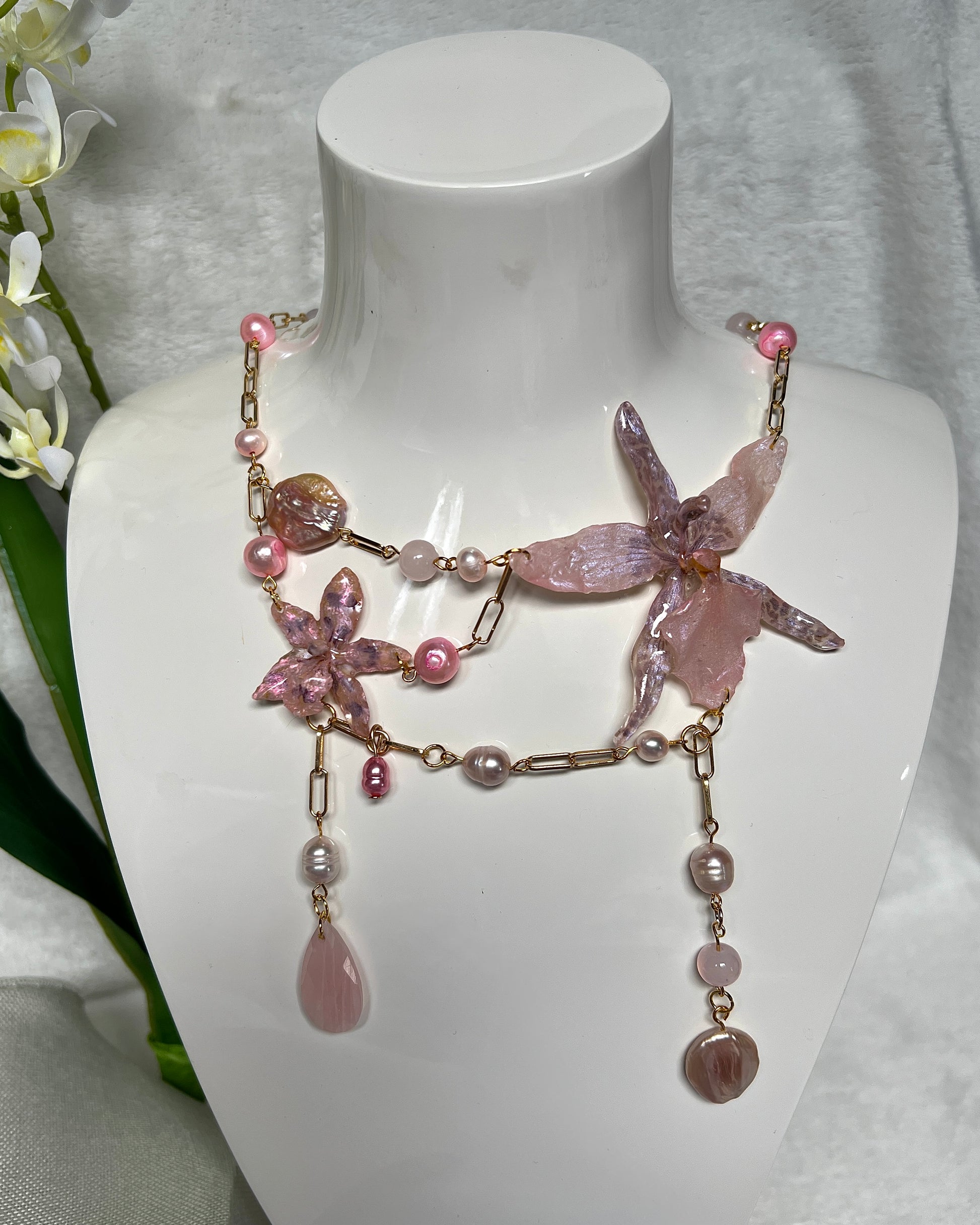 Two soft pink orchids bloom side by side on a golden necklace, capturing a delicate balance of romance and elegance in every detail.