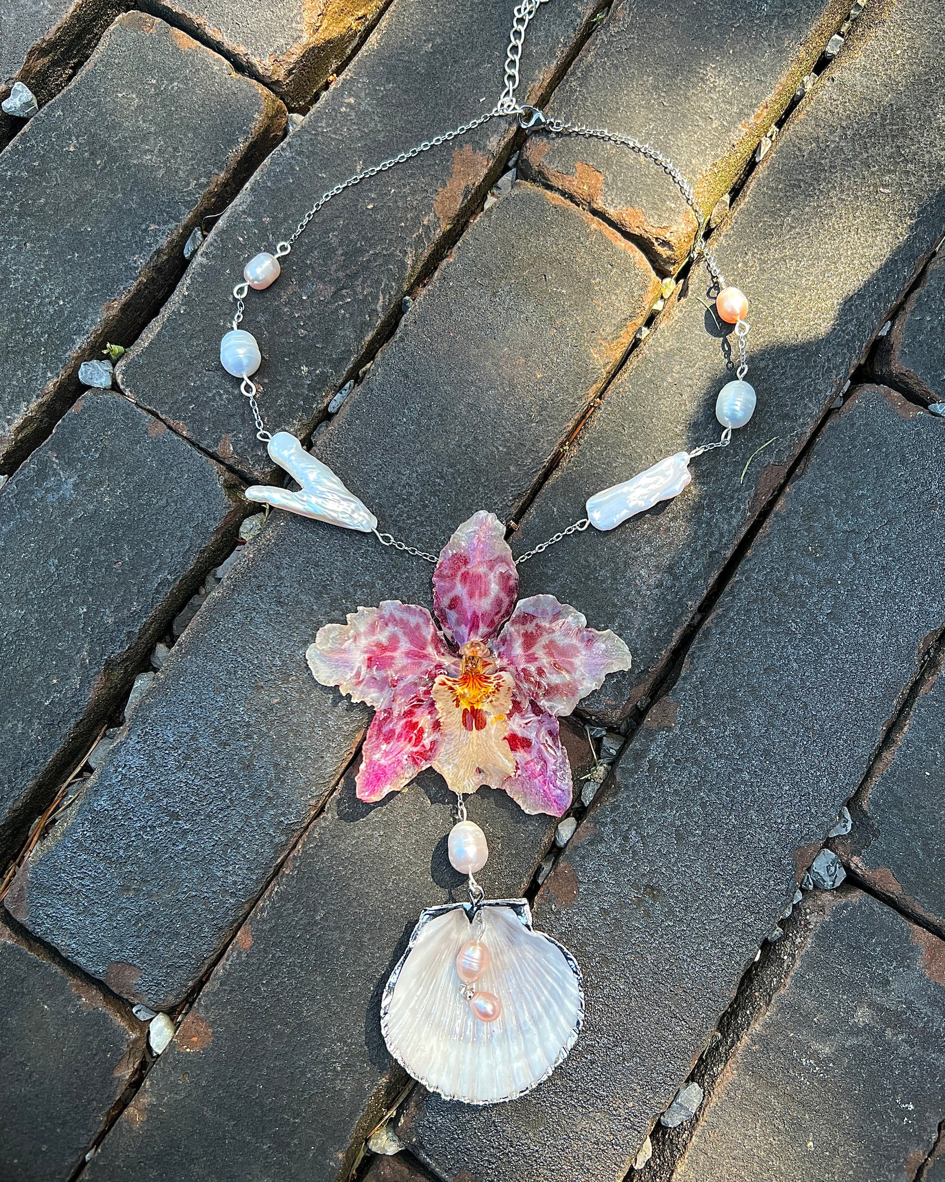 A pink-spotted hybrid orchid, delicate and striking, hanging from a slender silver chain. Large freshwater pearls and a small shell add a touch of ocean elegance, like a gentle secret carried on the sea breeze.