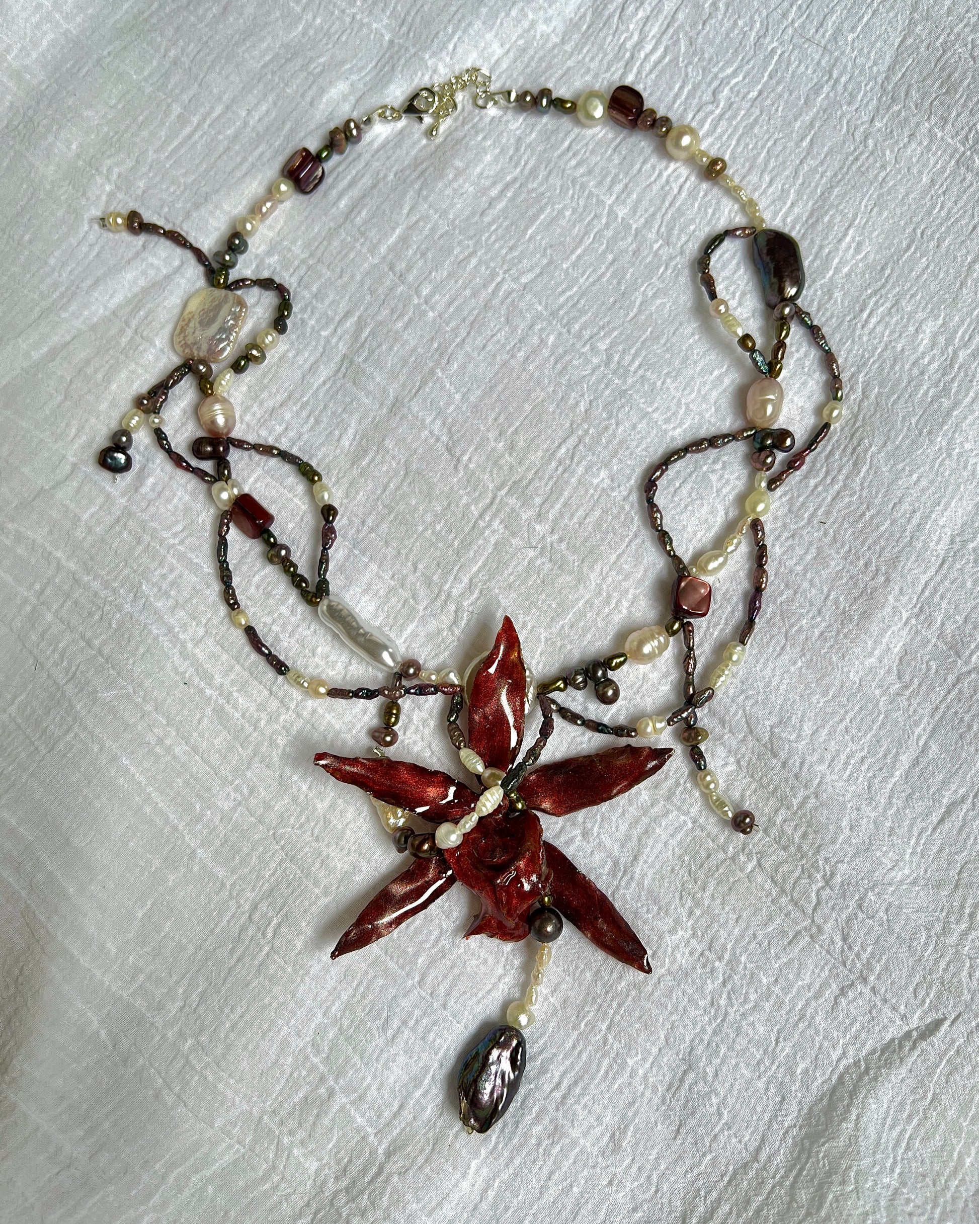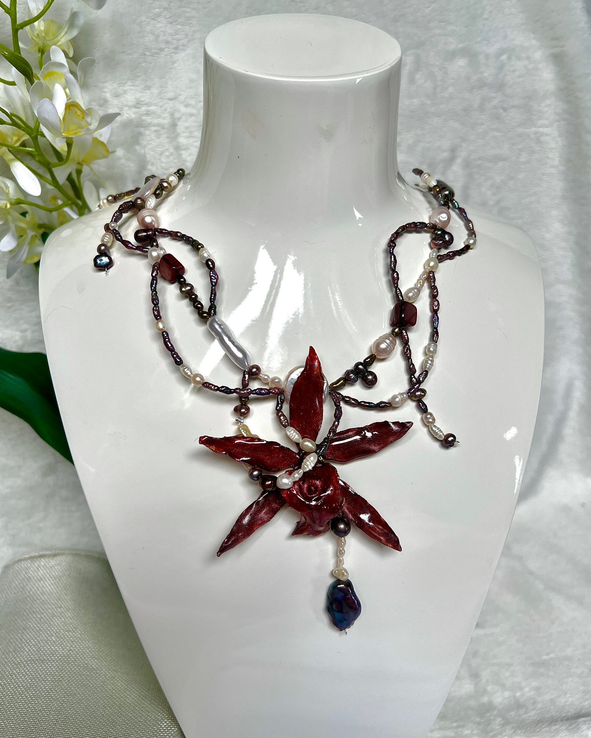 A wine-red glazed orchid graces a necklace of dark and white freshwater pearls, blending deep passion with timeless sophistication.