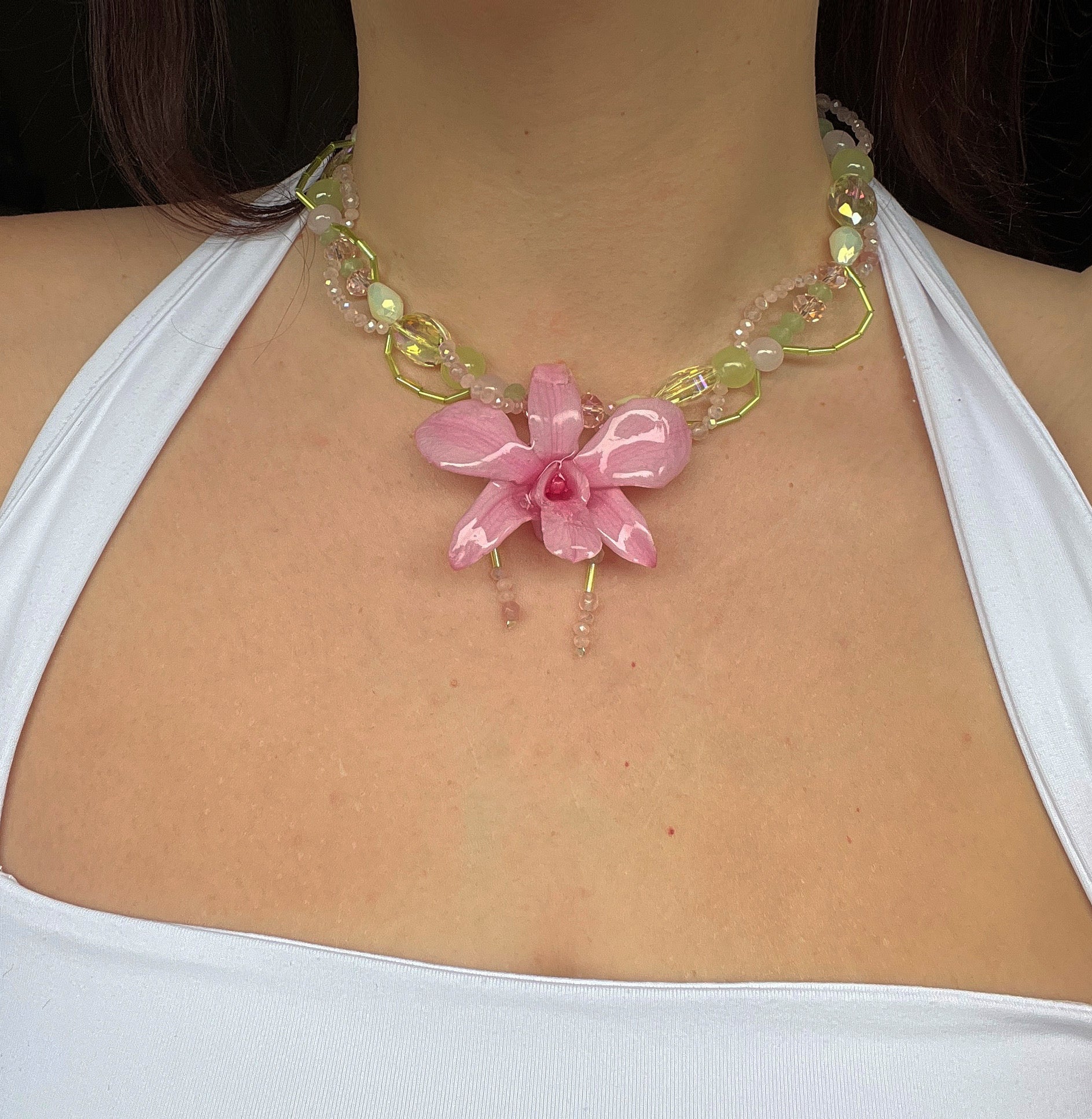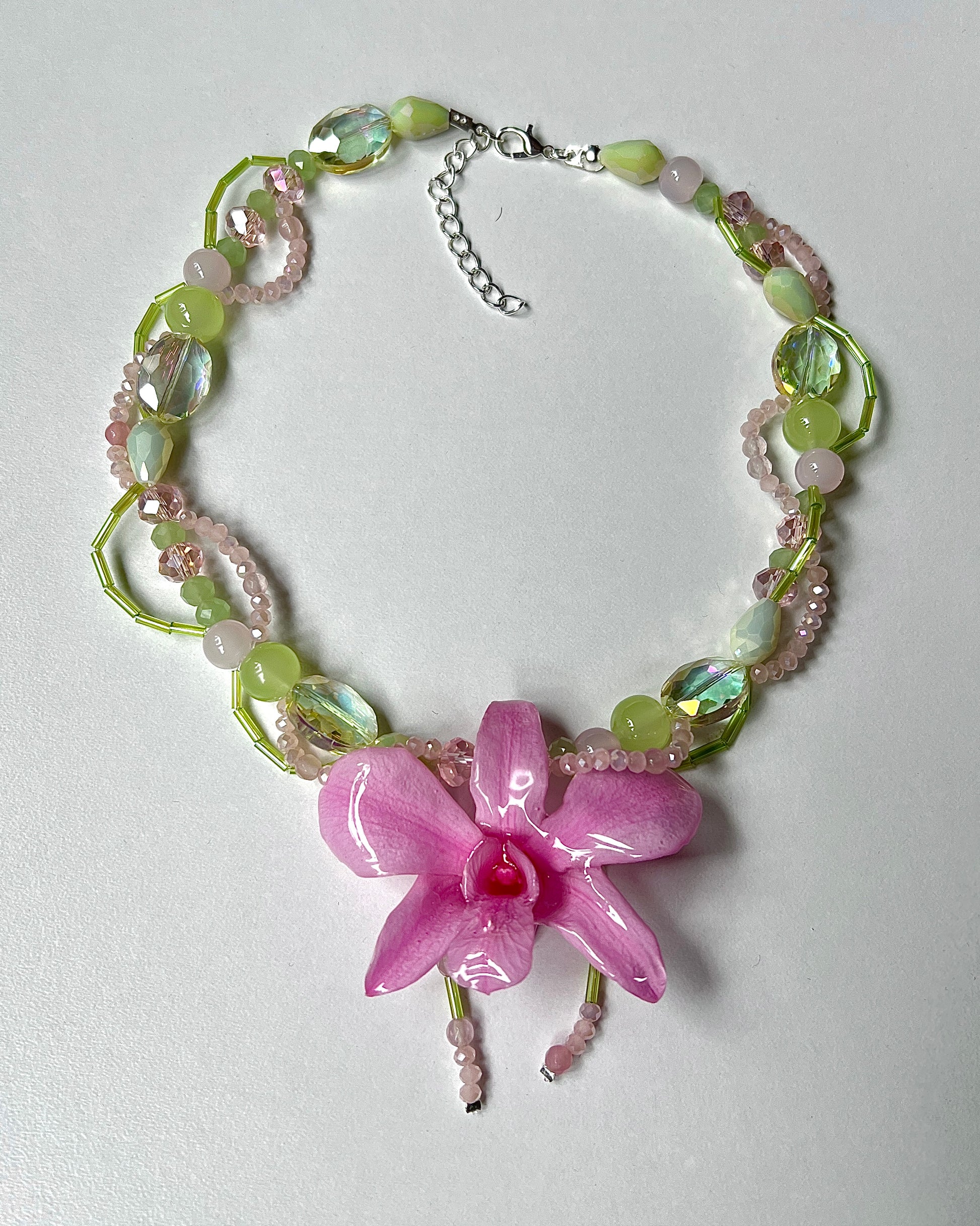 A sophisticated green-hued necklace, crowned with an opulent pink orchid centerpiece, where botanical beauty meets artisanal elegance