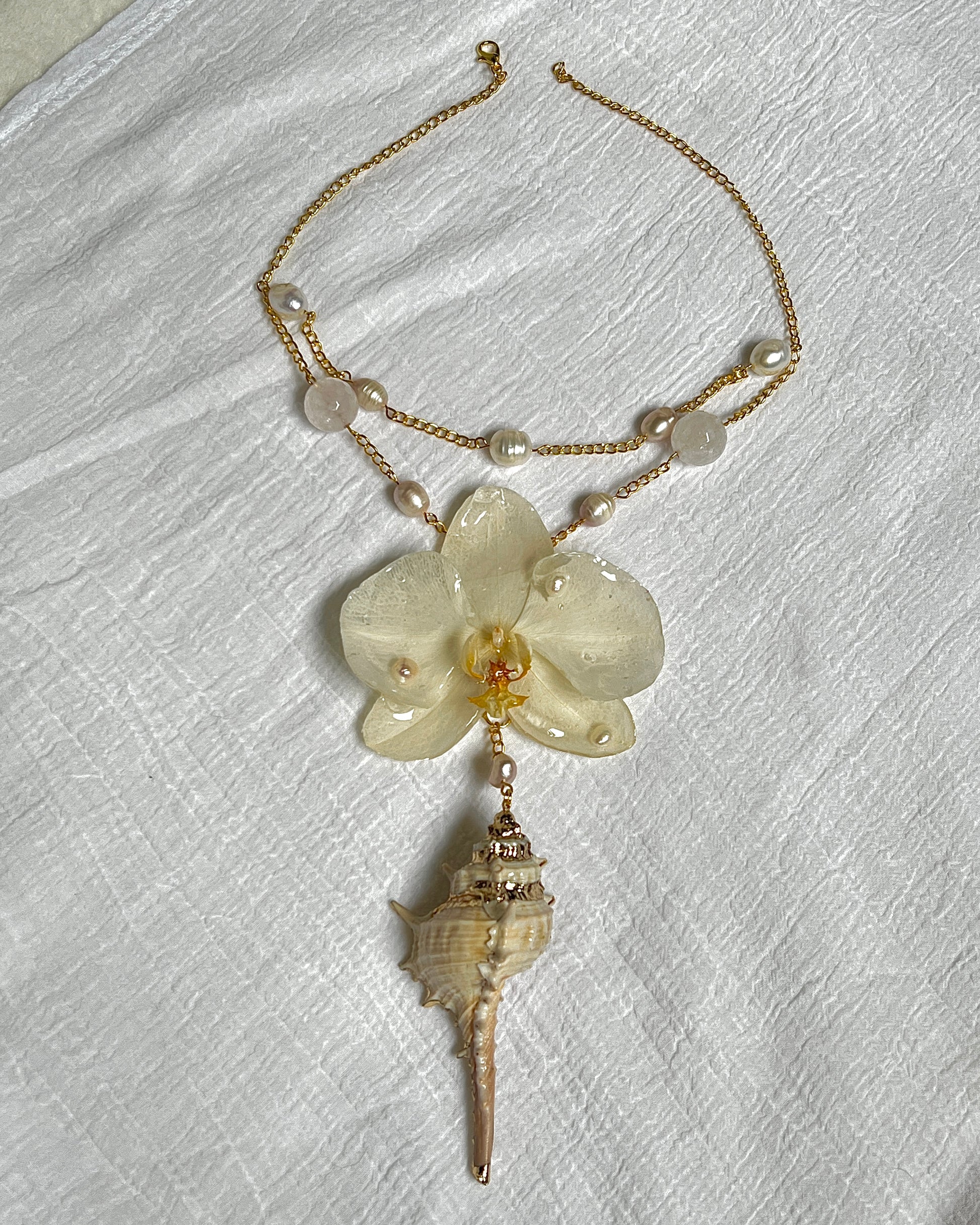 radiant white orchid paired with a dramatic spiky shell on a gleaming gold chain • a powerful statement piece that merges raw coastal beauty with refined elegance.