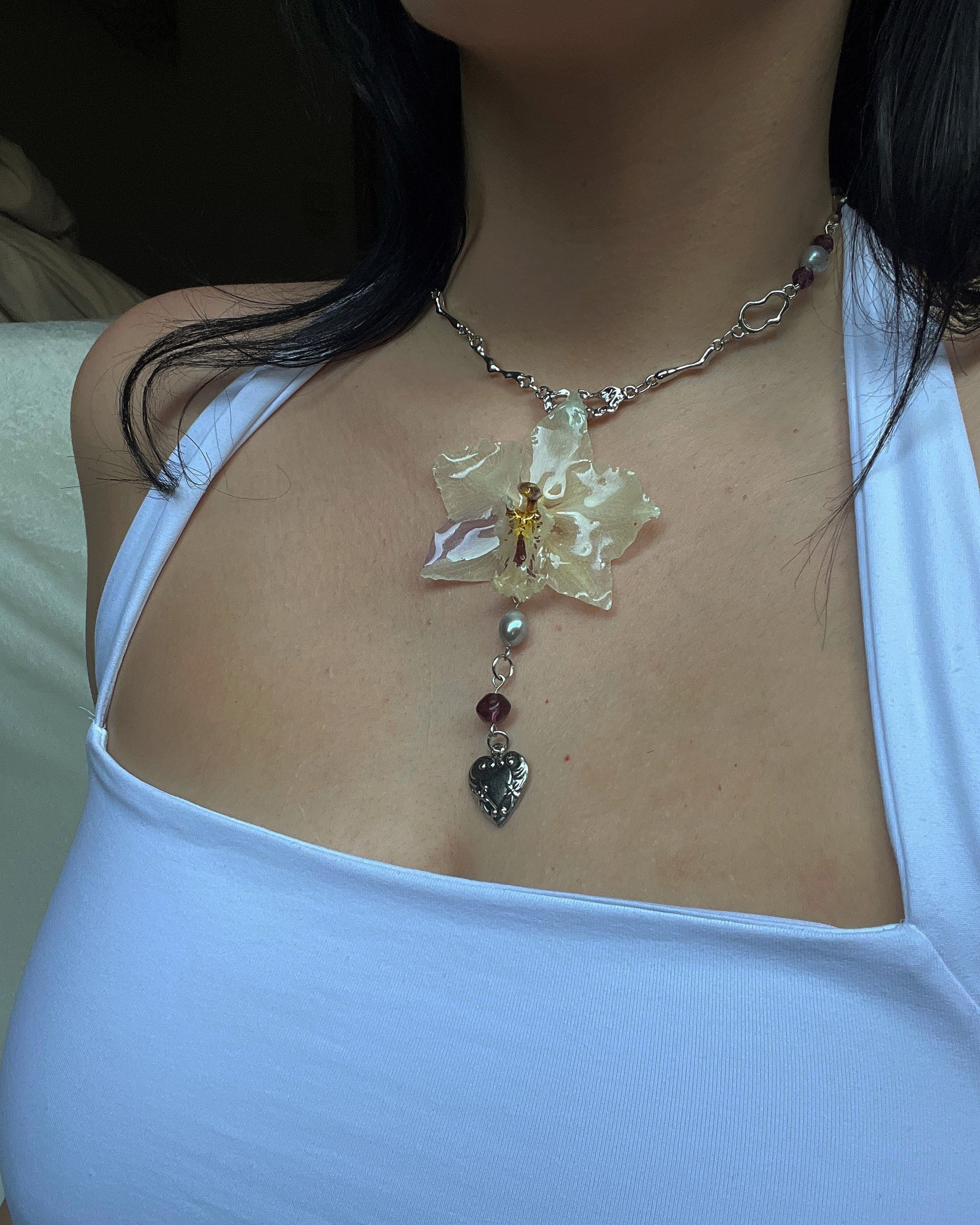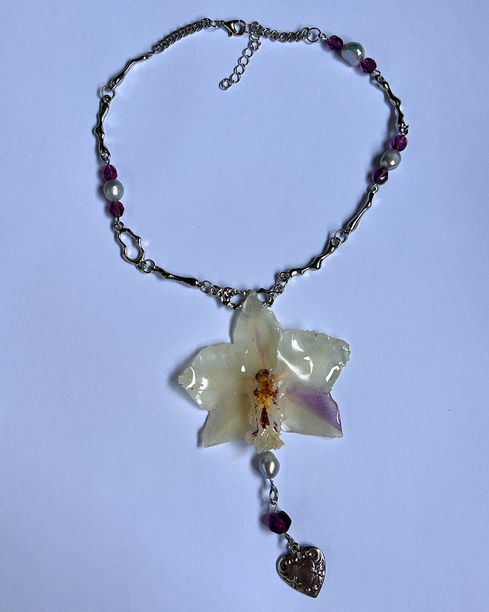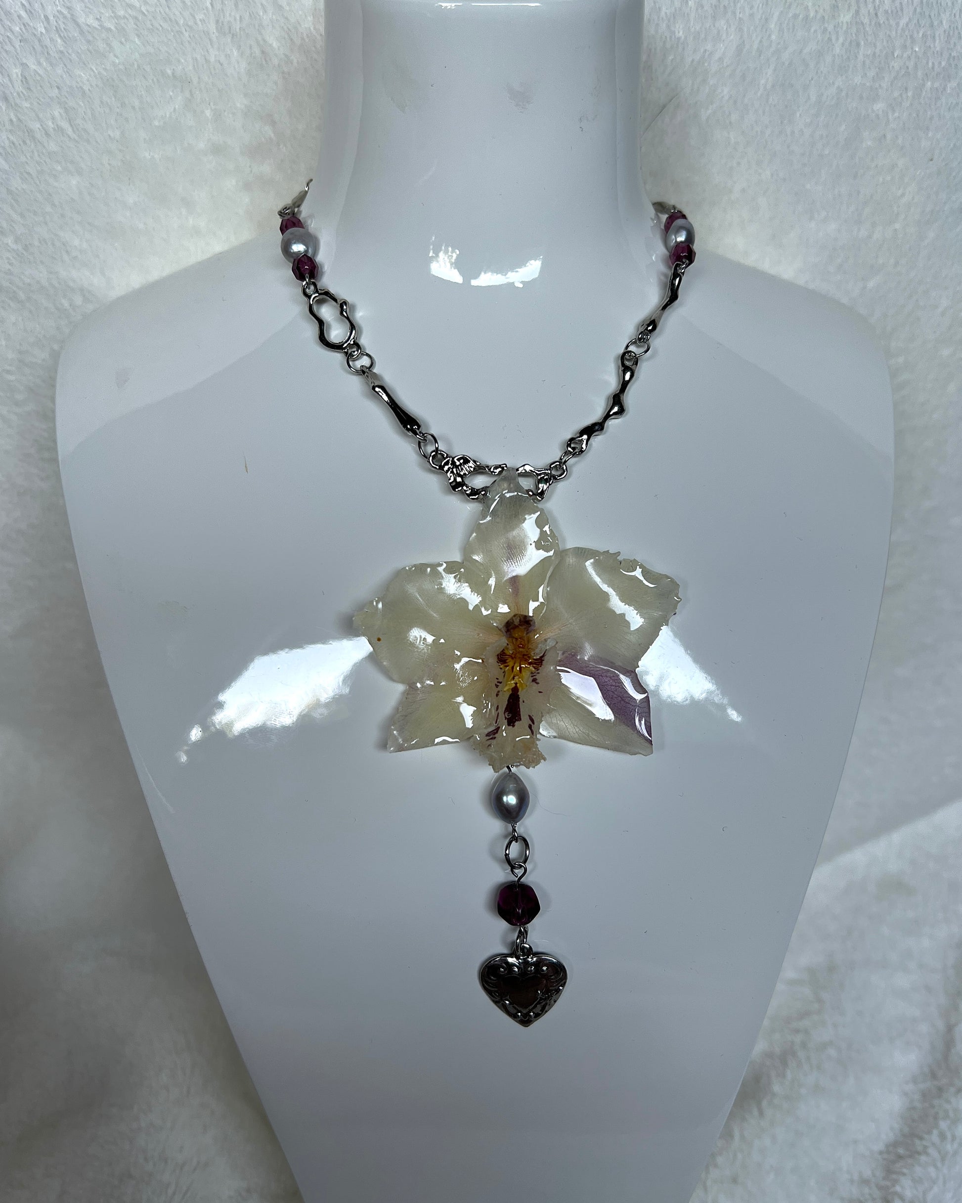 hybrid orchid with silver necklace and a heart oendant that matches the vibe
