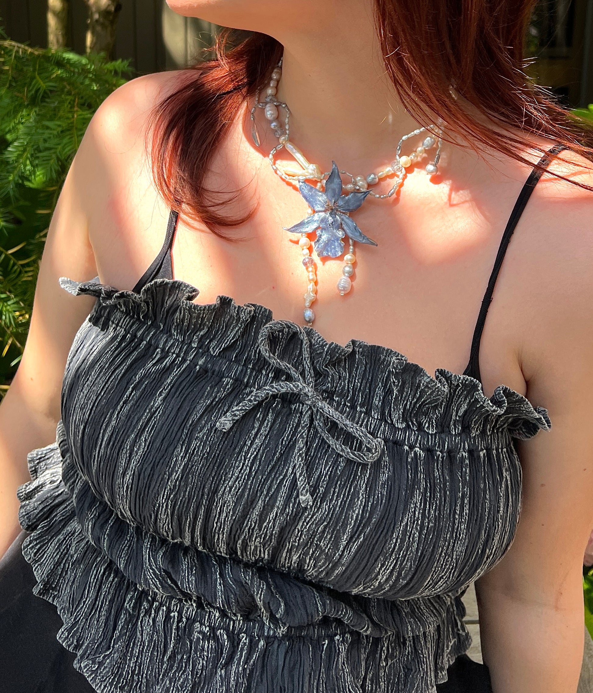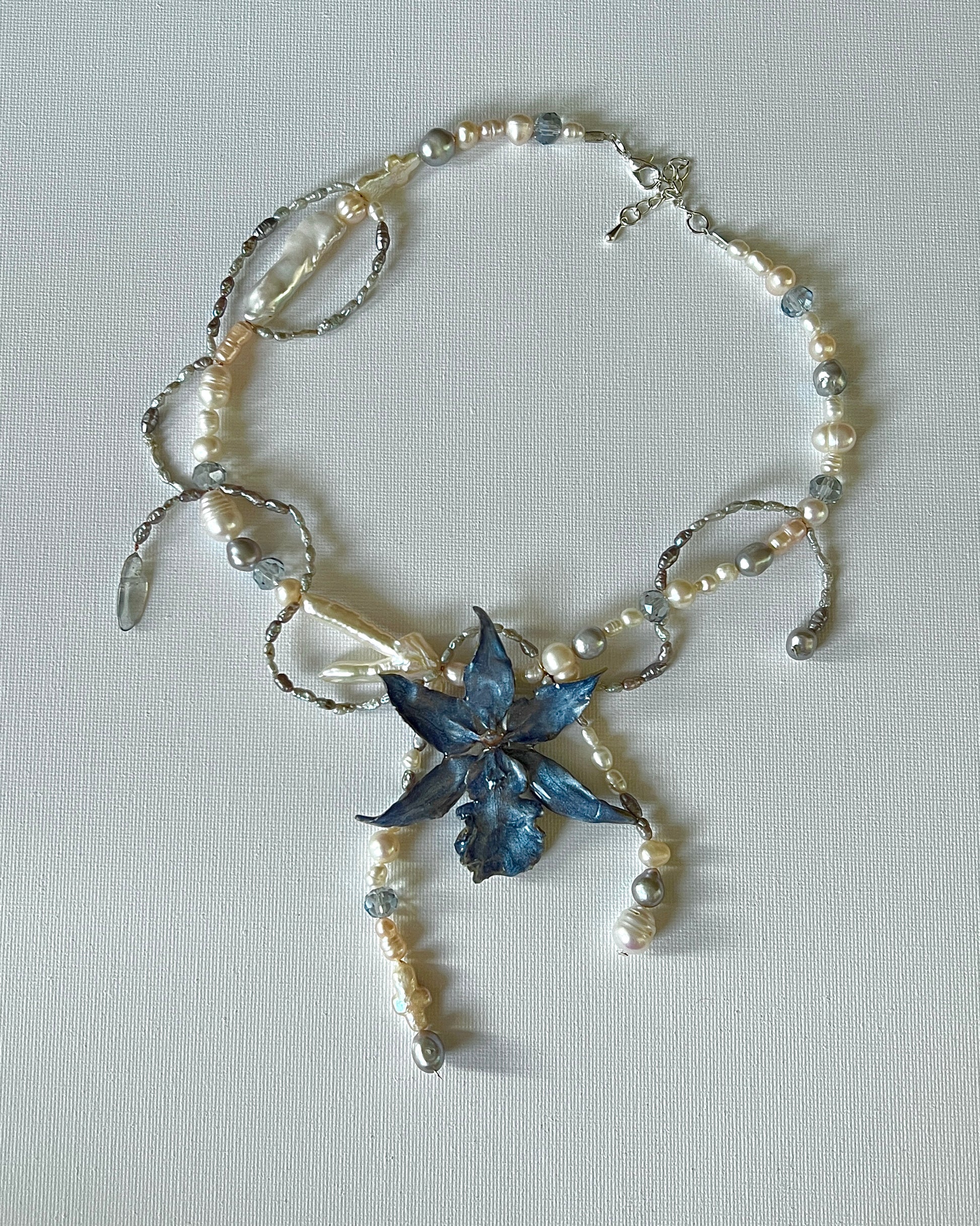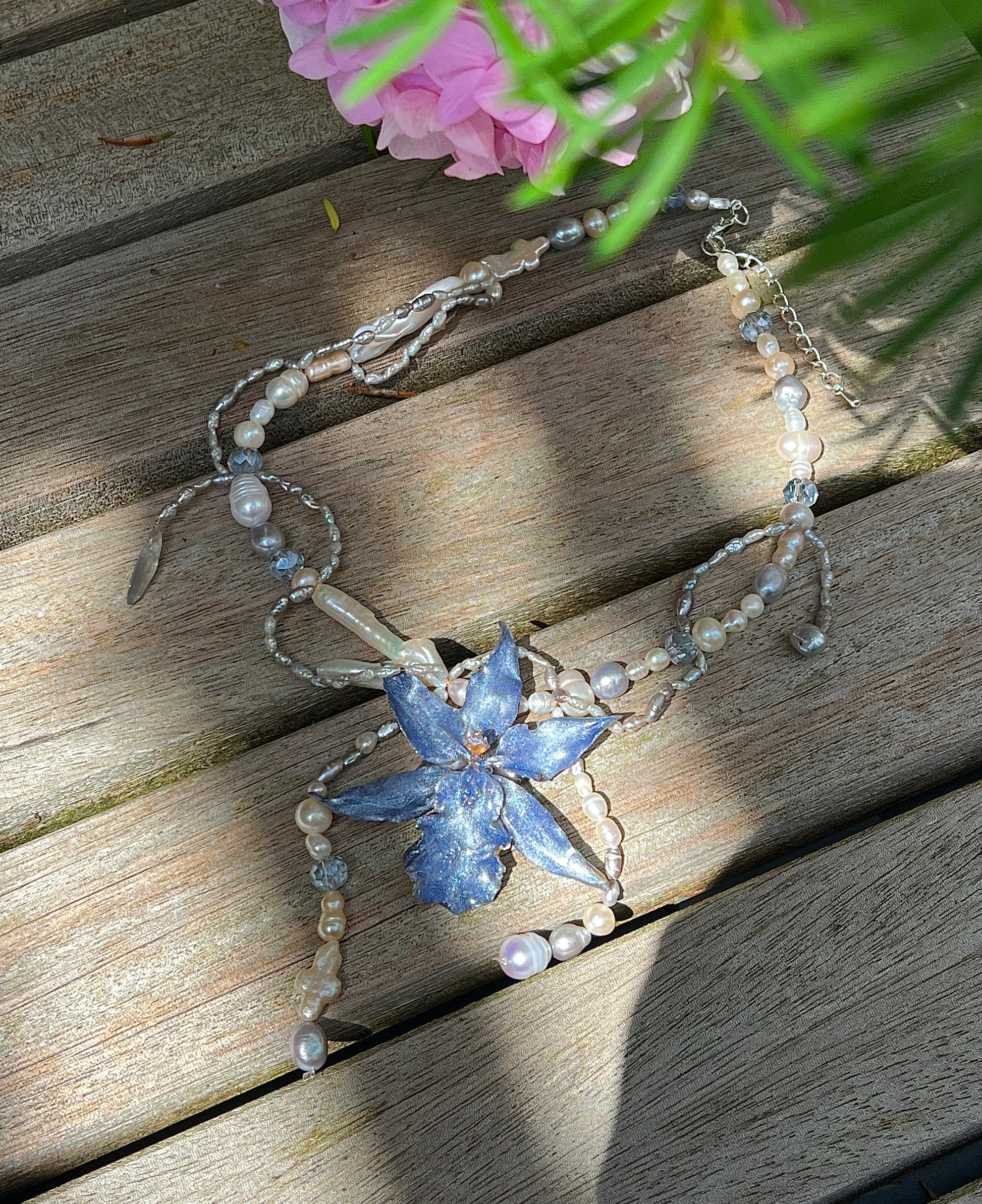 A wild blue orchid in full bloom, its petals sharp yet graceful, reaching into the night. Freshwater pearls shimmer like moonlight, and soft little charms whisper secrets only the stars would know.