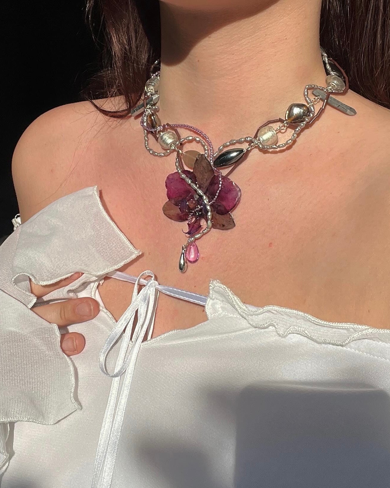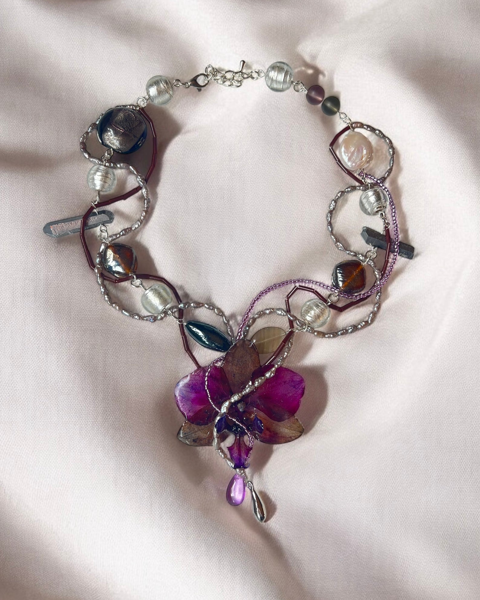 A vibrant orchid bloom sits at the heart of this handcrafted necklace, entwined with freshwater pearls, shimmering beads, and sculpted wire. Inspired by ocean reefs and wild florals, it's a bold, artistic statement.