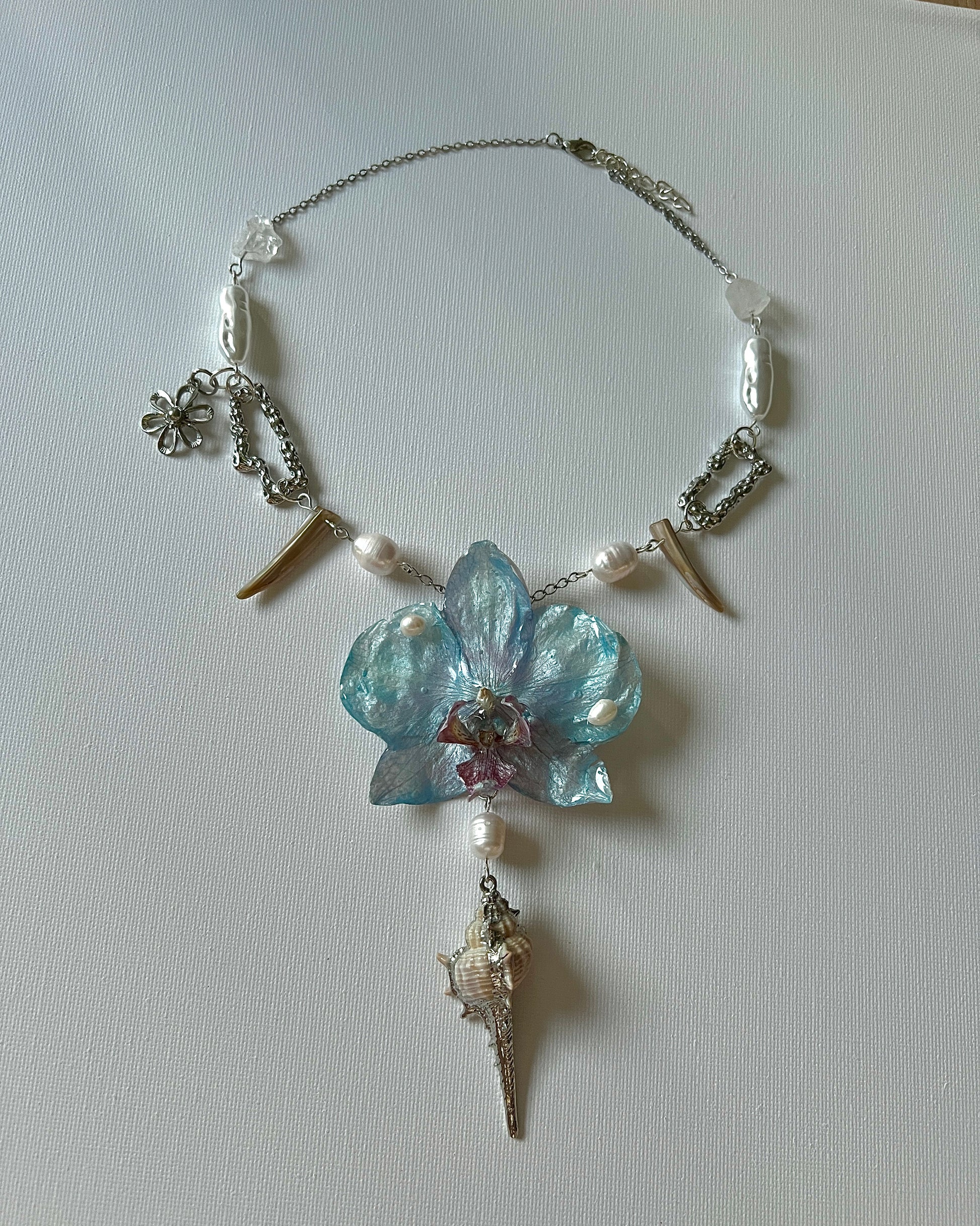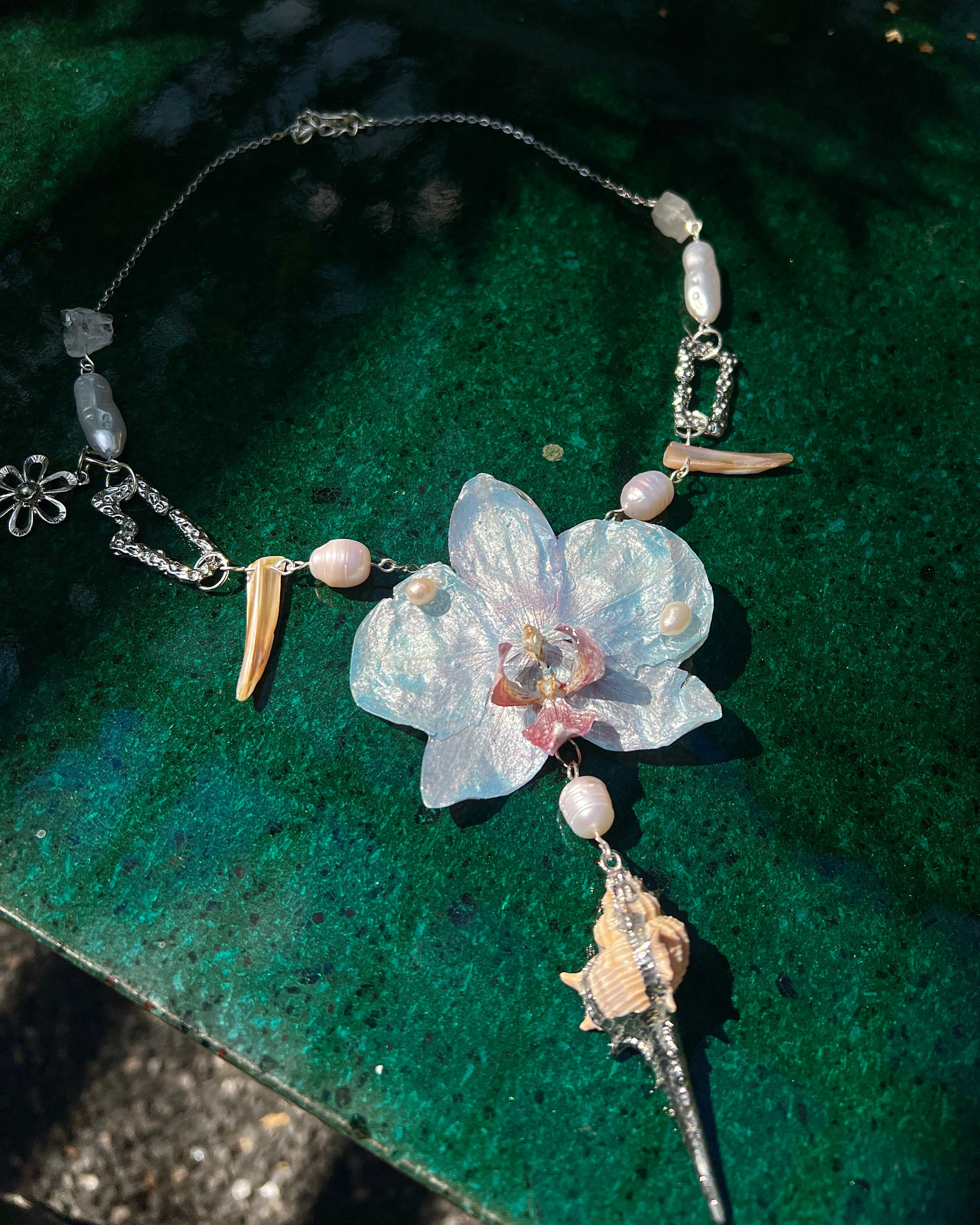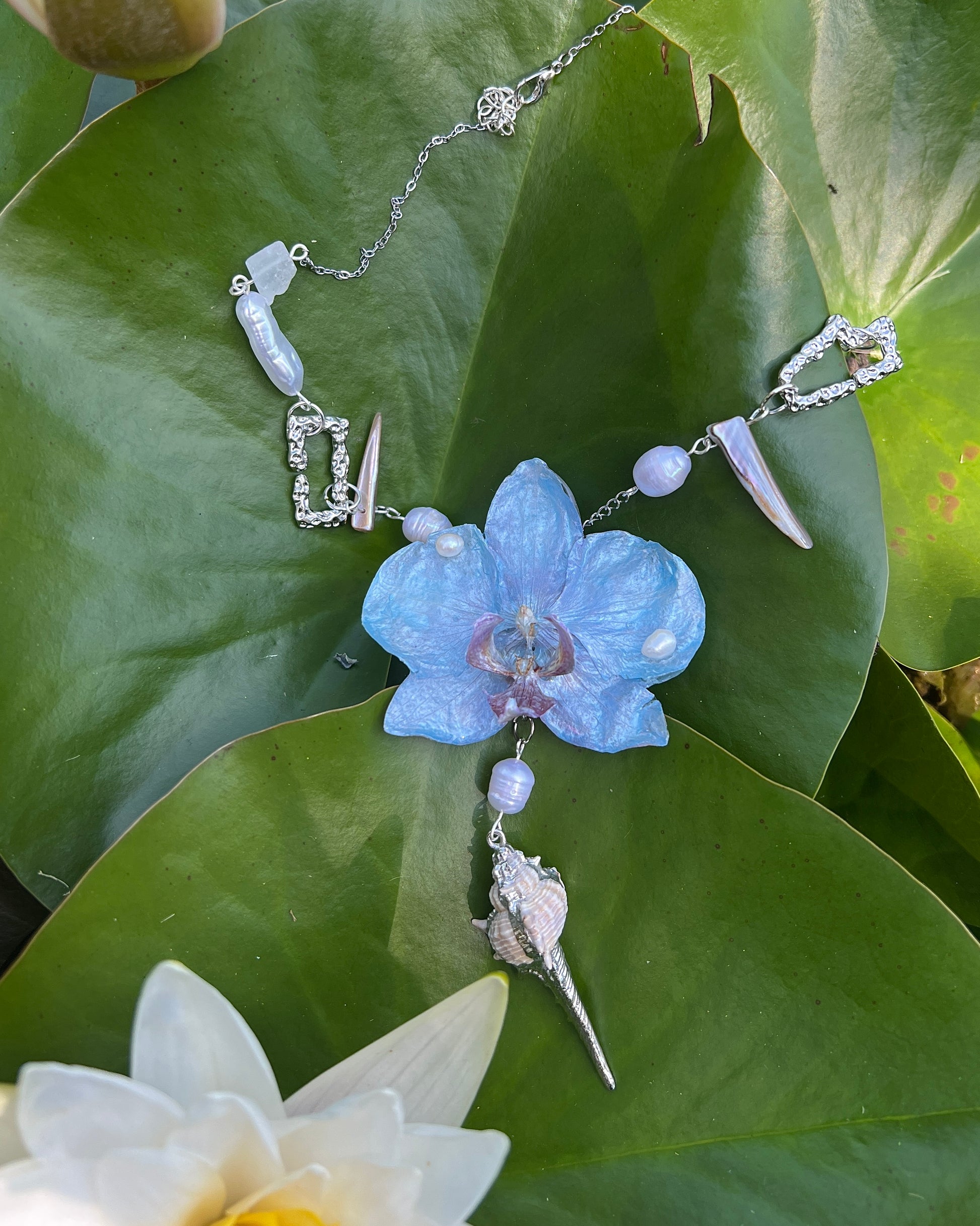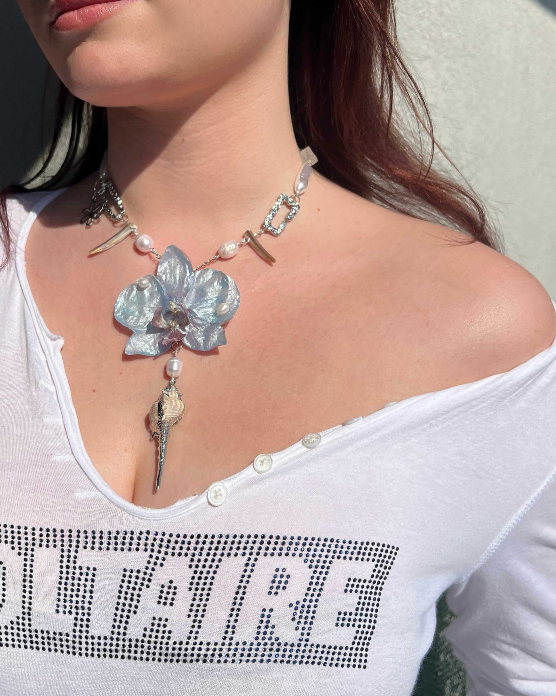 A glossy blue orchid paired with a striking spiky shell, hanging from a delicate silver chain. Bold and unique, it captures the wild beauty and mystery of the oceanβs edge.