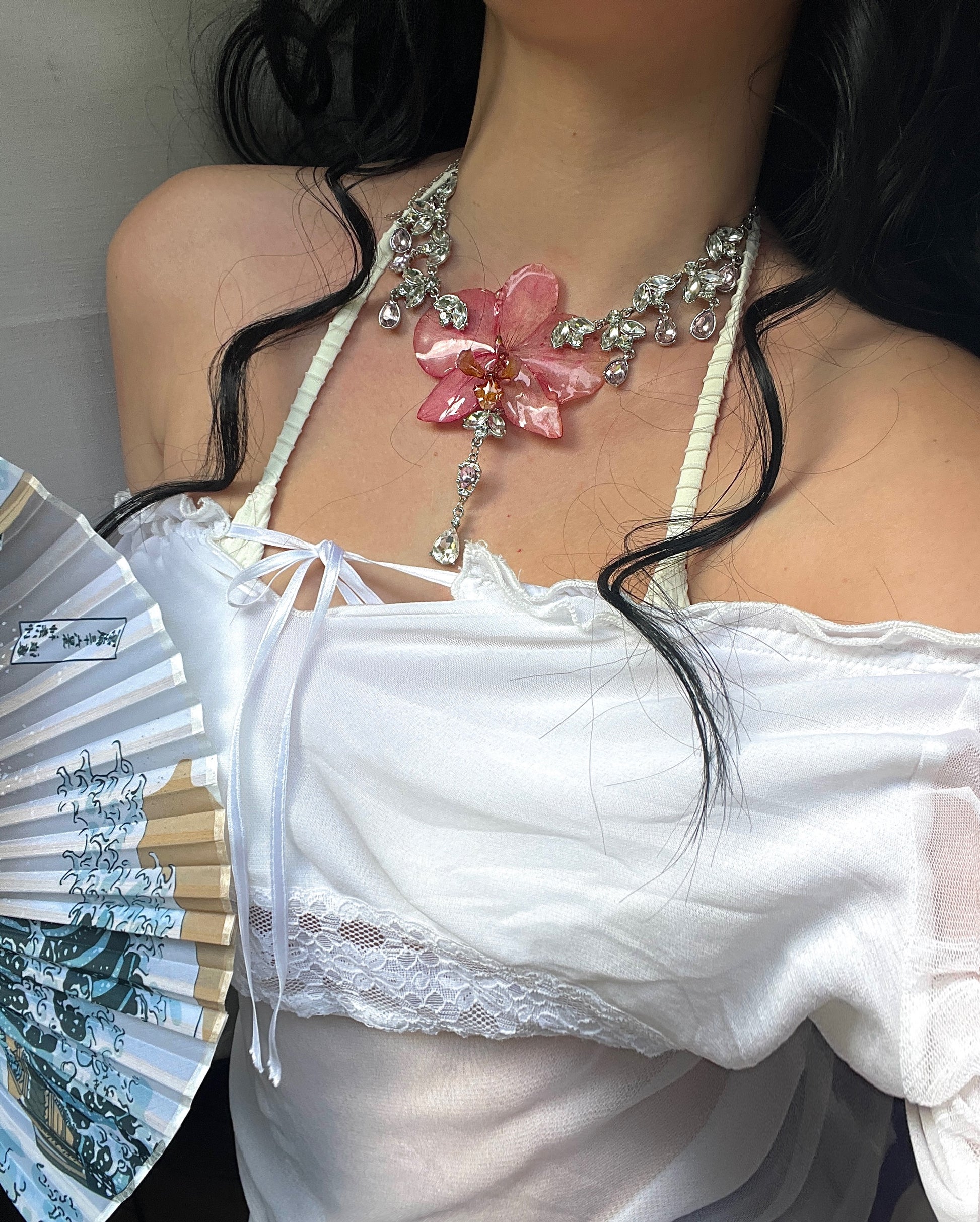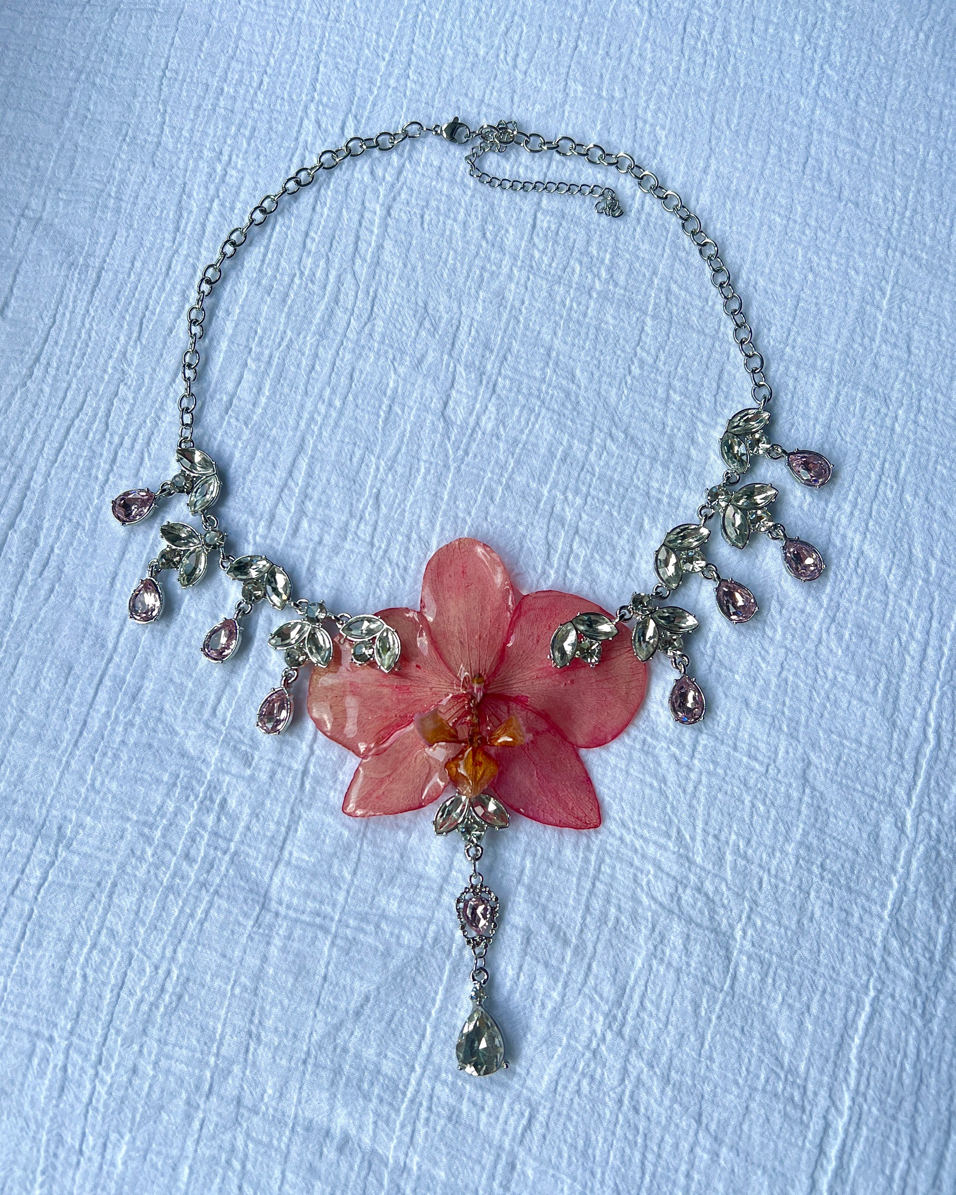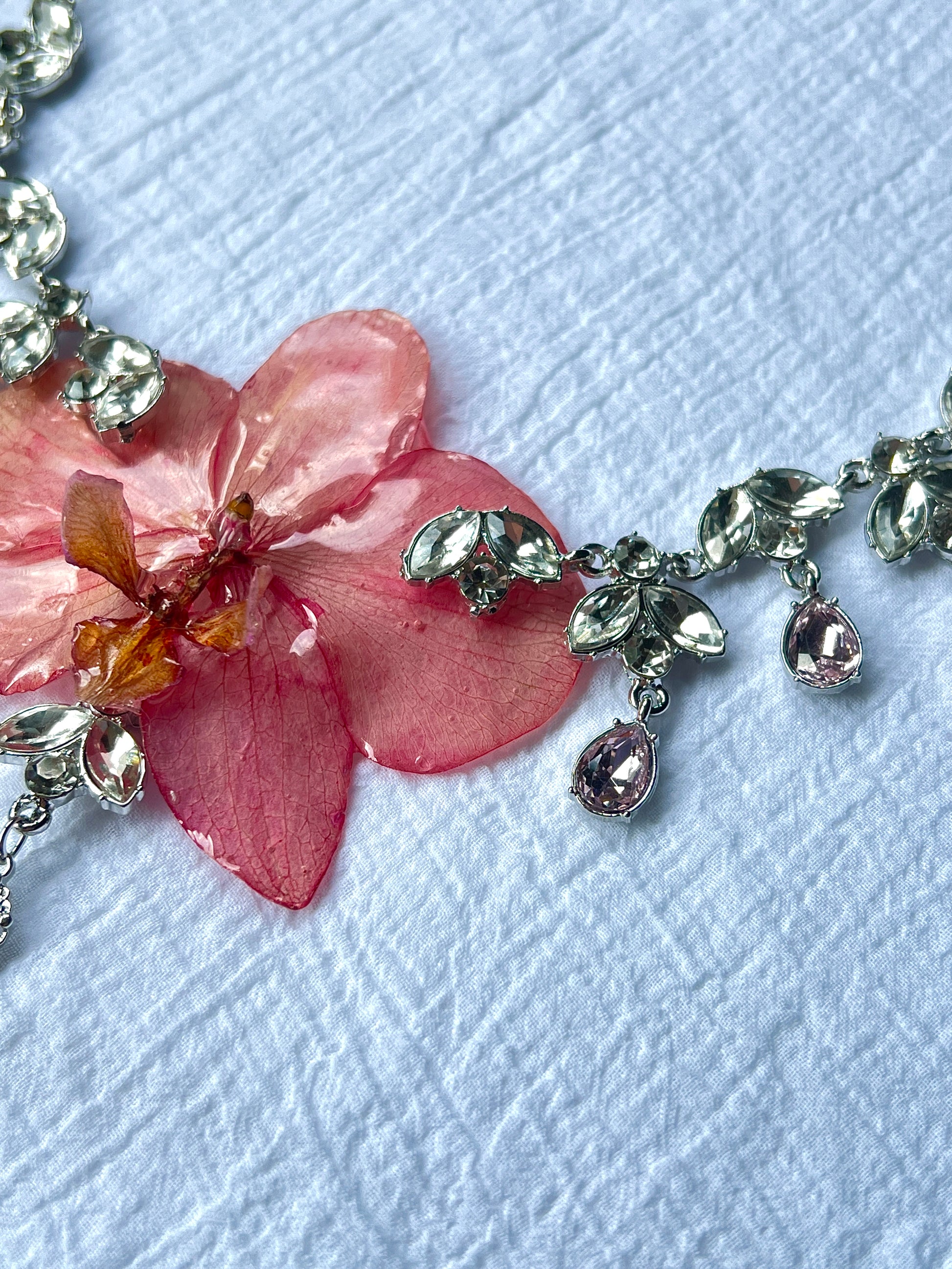 Elegant necklace with a pink orchid centerpiece, crystal drops, and silver-toned leaf accents.