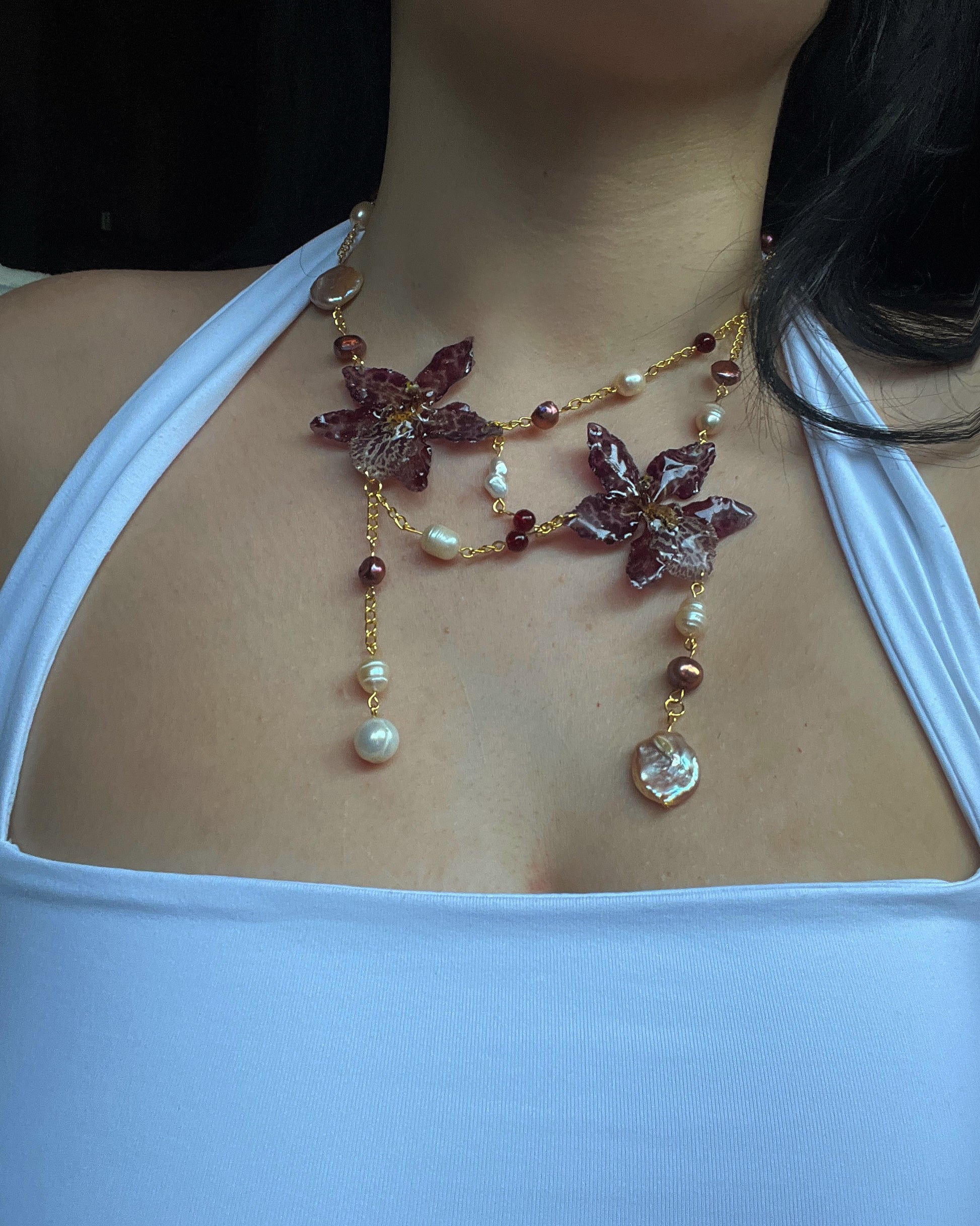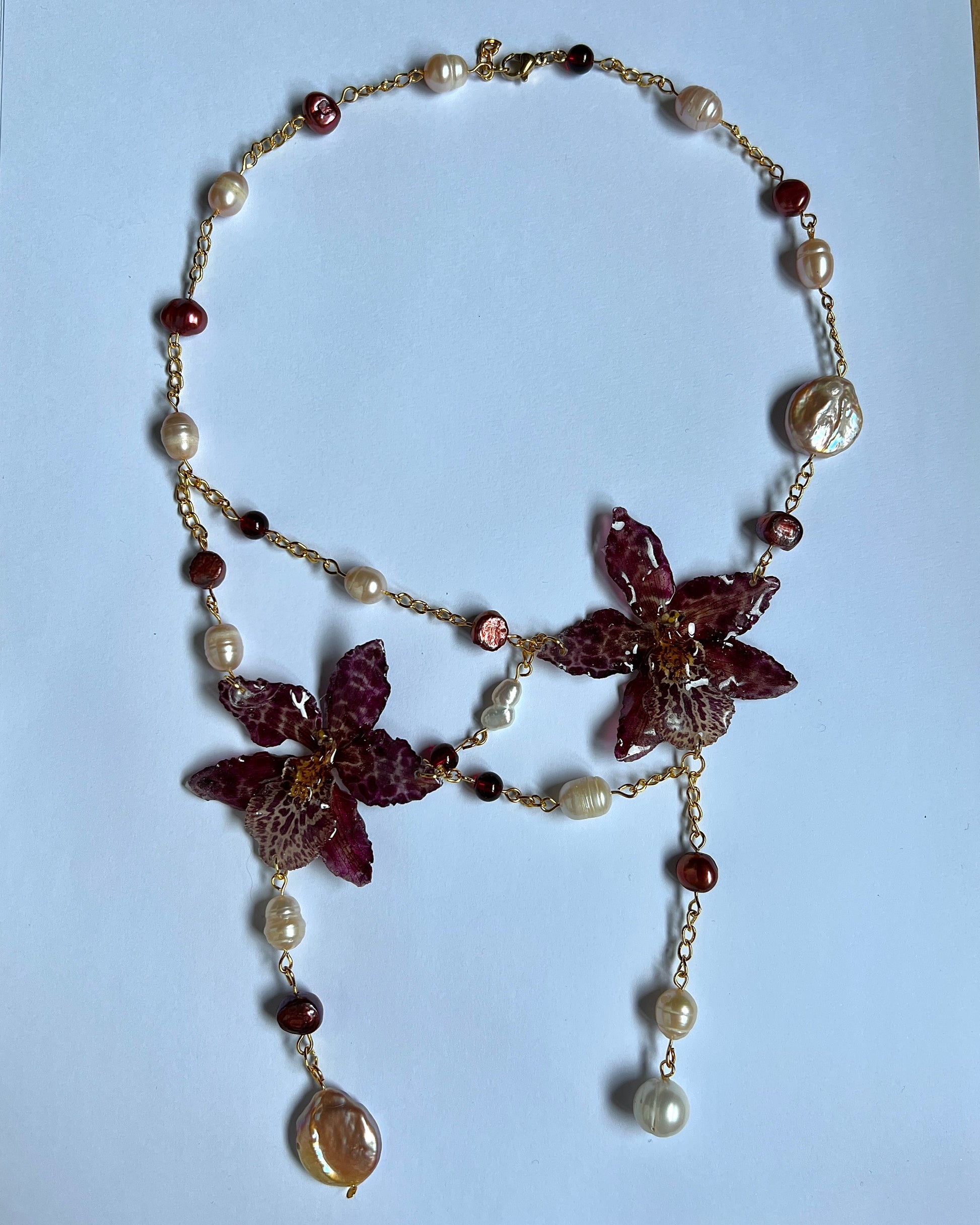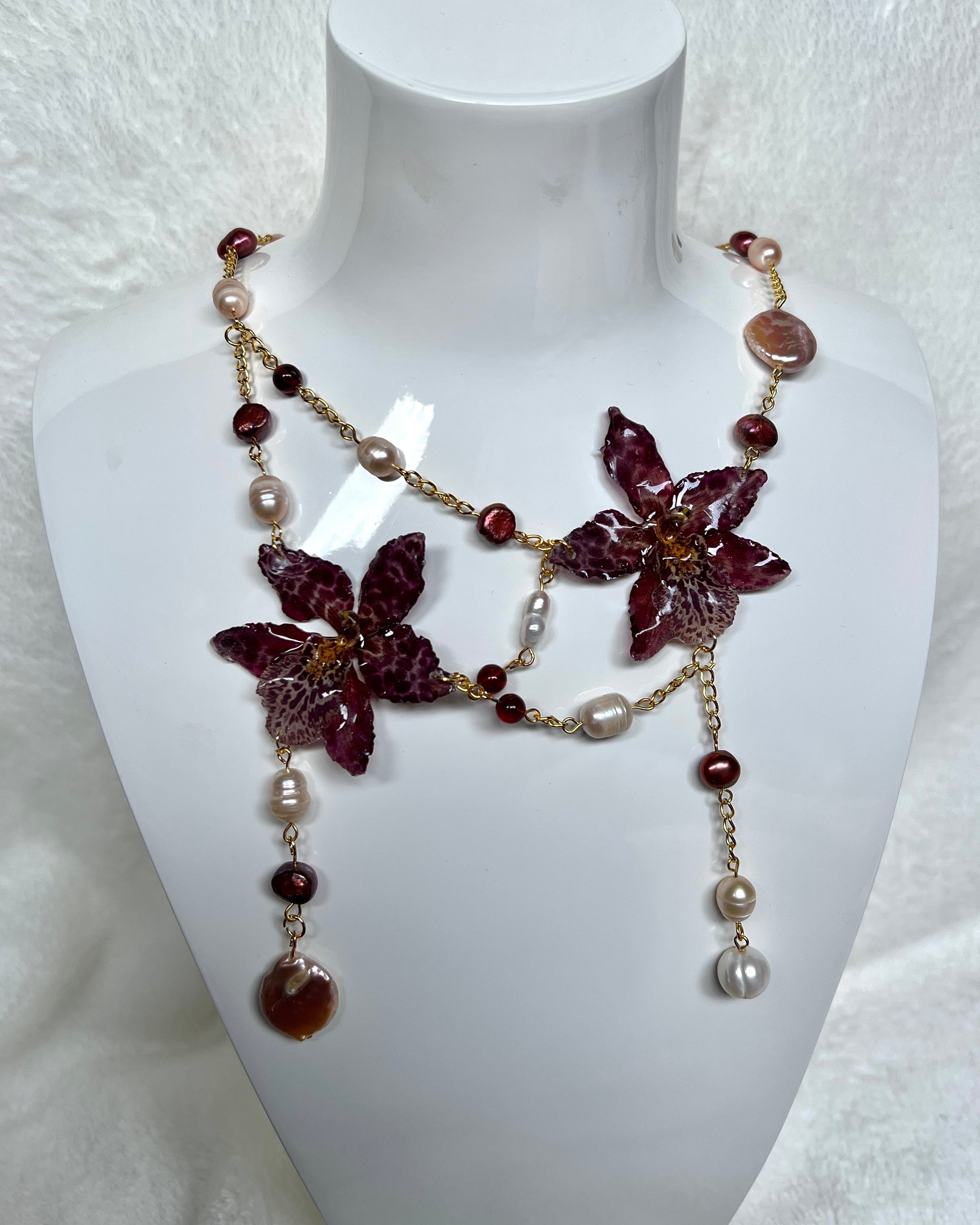 Two radiant orchids and freshwater pearls gleam along a golden chain.