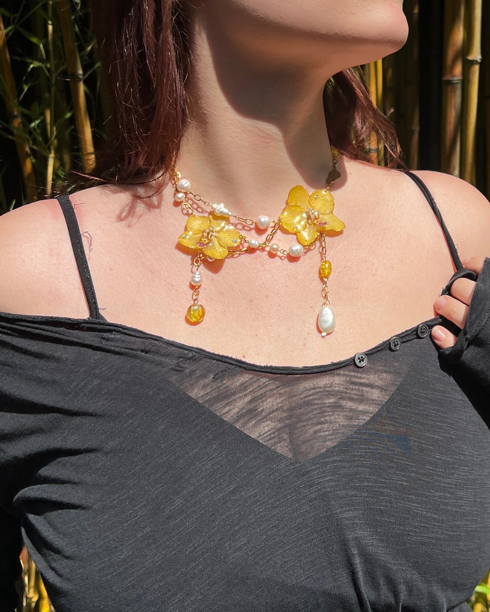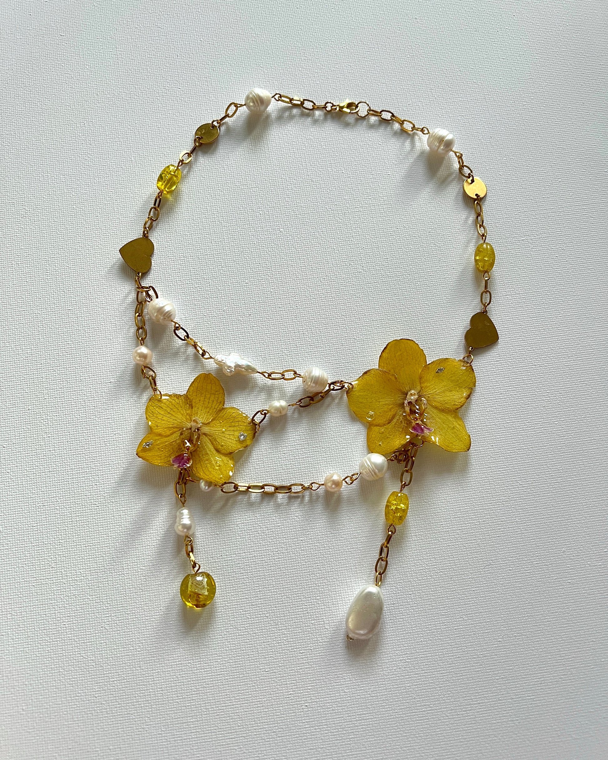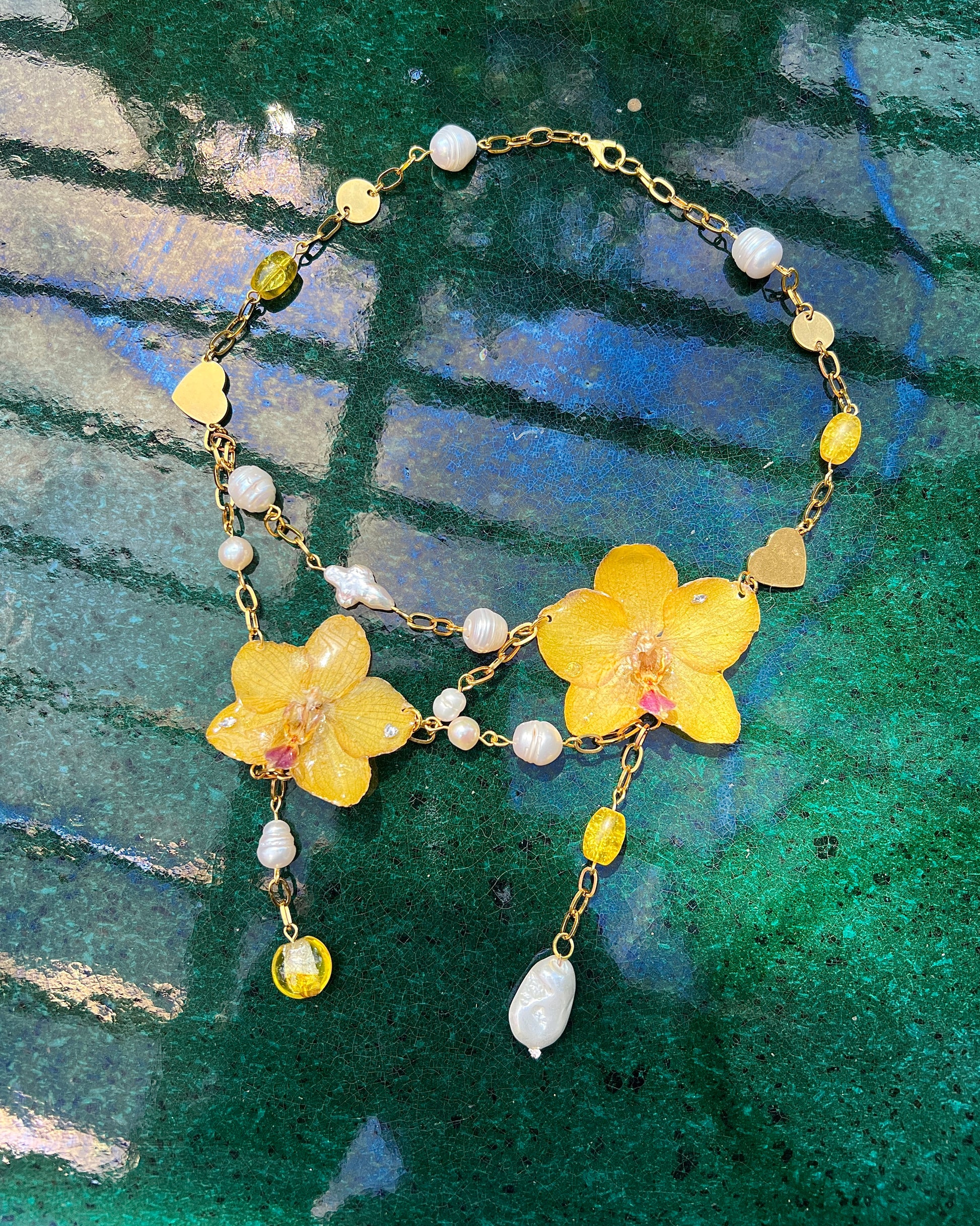 Two gentle yellow orchids wrapped in a tender embrace, touched by the glow of freshwater pearls and little charms filled with love.